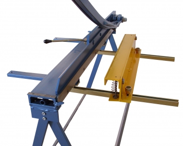 Přidržovač, který je upevněn na stole stroje a slouží k přidržování plechu při stříhání, je ovládán pákou s výstředníkem. Celý stroj je možno rozebrat na několik dílů a opět rychle na novém pracovišti složit.